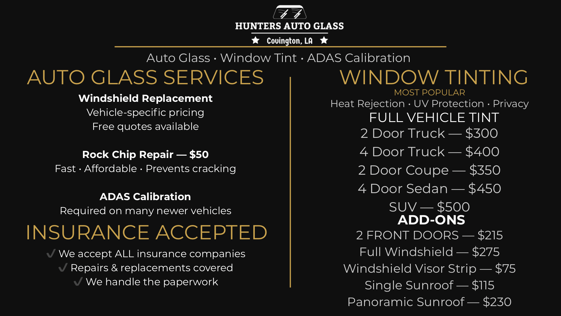 Hunter’s Auto Glass is your one-stop-shop for every auto glass service you may need in Covington, SC. Whether you need windshield replacement, heavy glass, or ADAS calibration - we can handle the job! Our family owned company treats our clients with care & every auto glass replacement is covered with a lifetime warranty.